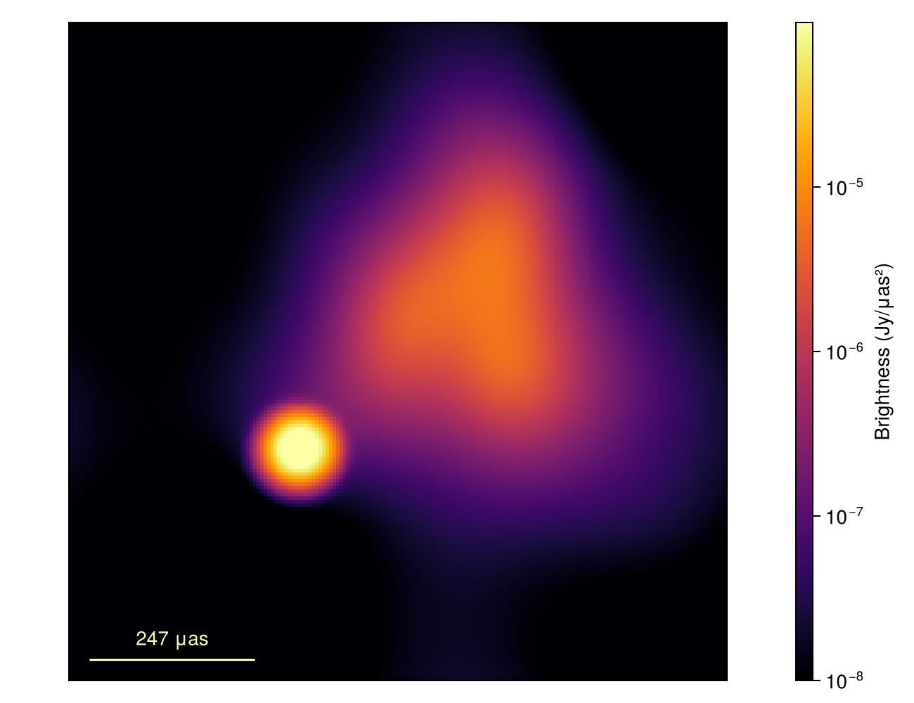endsky (generic function with 1 method)For this tutorial we decided to image a very compact AGN. Thus, we will use a small FOV for a 15 GHz observation. Namely, we will use a 5000 μas FOV with 64x64 pixels.