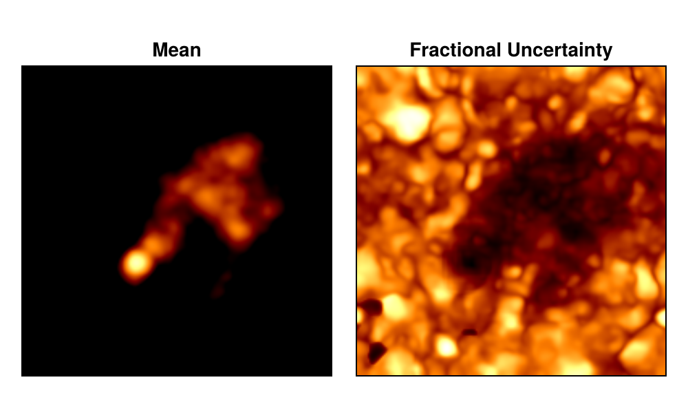 image!(axs[1, 2], simg ./ (max.(mimg, 1.0e-12)), colormap = :afmhot);axs[1, 2].title = "Fractional Uncertainty"