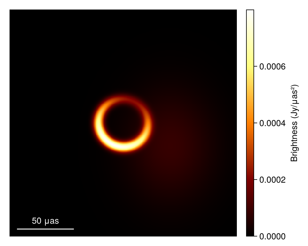 xopt, sol = comrade_opt(post, BBO_adaptive_de_rand_1_bin_radiuslimited(); maxiters = 50_000);Given this we can now plot the optimal image or the maximum a posteriori (MAP) image.