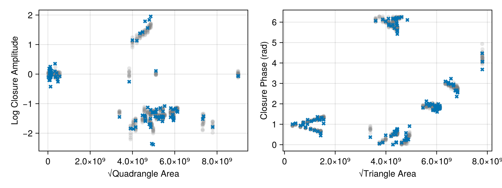 ax2 = Axis(fig[1, 2], xlabel = "√Triangle Area", ylabel = "Closure Phase (rad)")