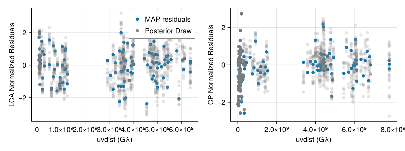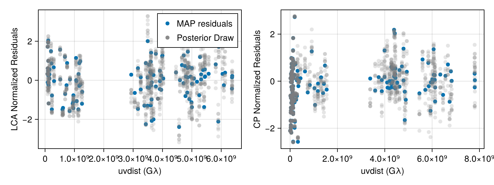 ax2, = baselineplot(fig[1, 2], res[2], :uvdist, :res, label = "MAP residuals", axis = (ylabel = "CP Normalized Residuals", xlabel = "uvdist (Gλ)"))