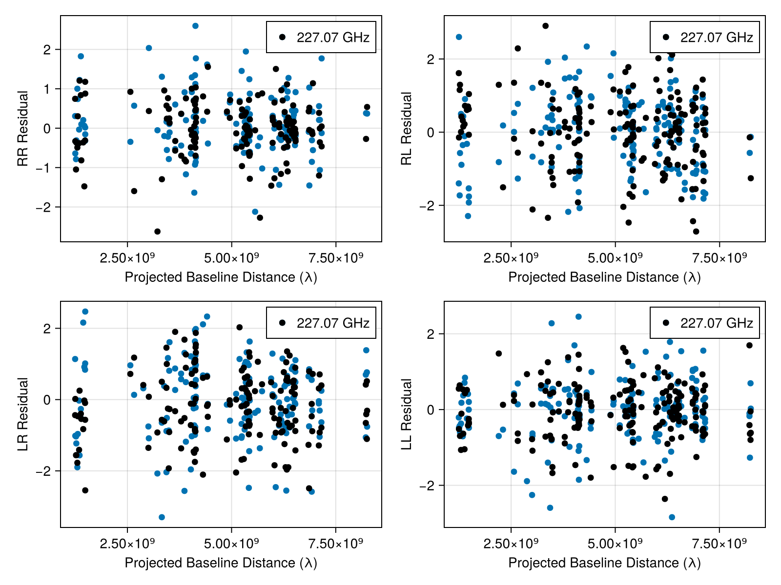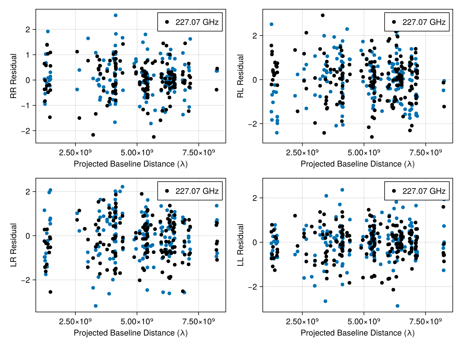 plotfields!(fig[2, 1], res[1], uvdist, x -> Comrade.measurement(x)[2, 1] / noise(x)[2, 1], axis_kwargs = (; ylabel = "LR Residual"))