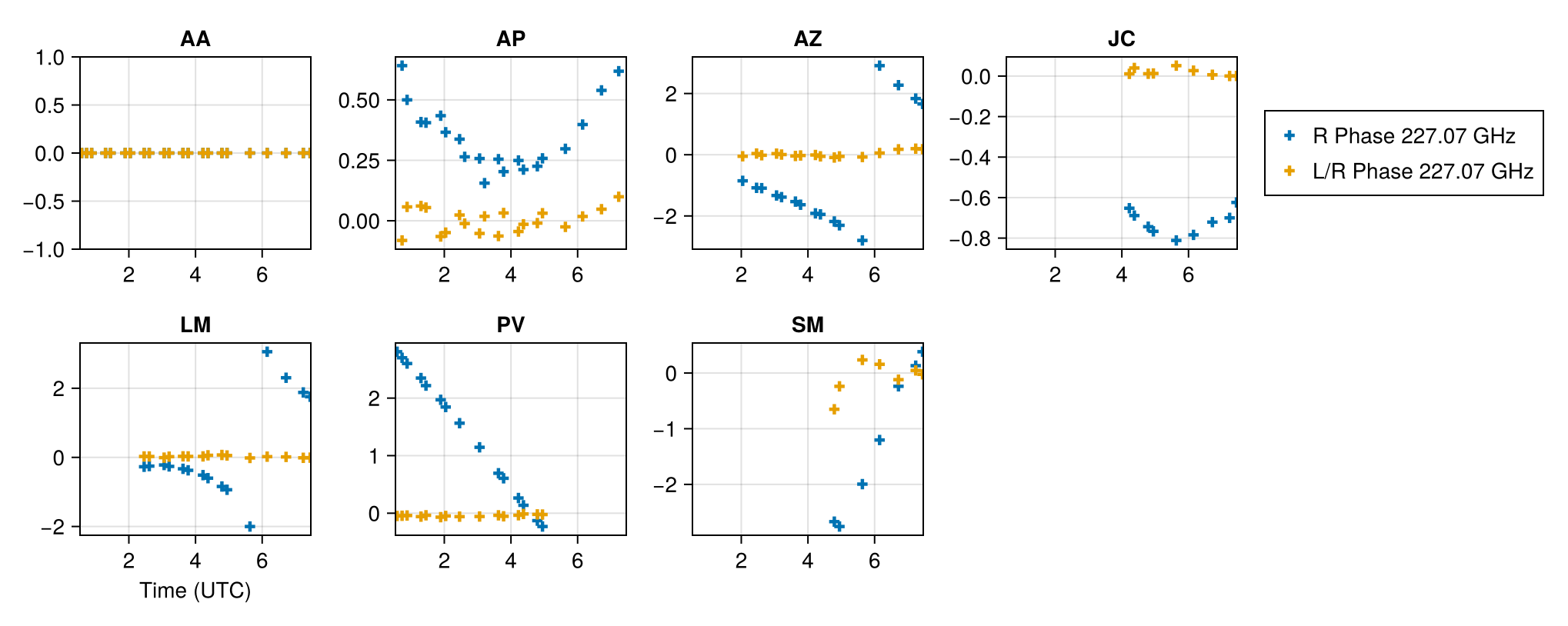 ─────────┴───────────────────┴─────────────────────────────────────────────────────────────Plotting the phases first, we see large trends in the righ circular polarization phase. This is expected due to a lack of image centroid and the absense of absolute phase information in VLBI. However, the gain phase difference between the left and right circular polarization is stable and close to zero. This is expected since gain ratios are typically stable over the course of an observation and the constant offset was removed in the EHT calibration process.
