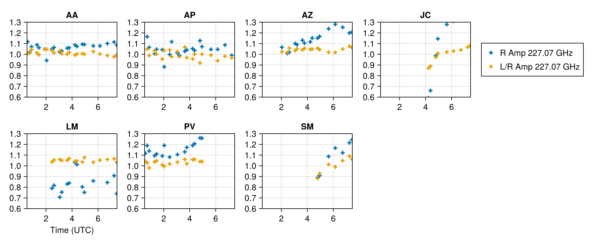 Moving to the amplitudes we see largely stable gain amplitudes on the right circular polarization except for LMT which is known and due to pointing issues during the 2017 observation. Again the gain ratios are stable and close to unity. Typically we expect that apriori calibration should make the gain ratios close to unity.