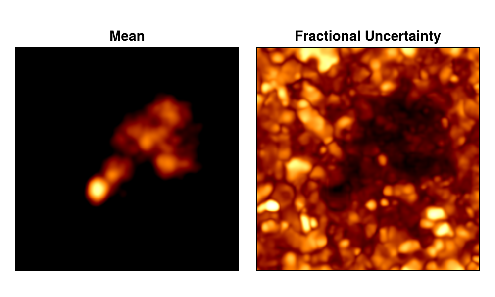 image!(axs[1, 2], simg ./ (max.(mimg, 1.0e-12)), colormap = :afmhot);axs[1, 2].title = "Fractional Uncertainty"