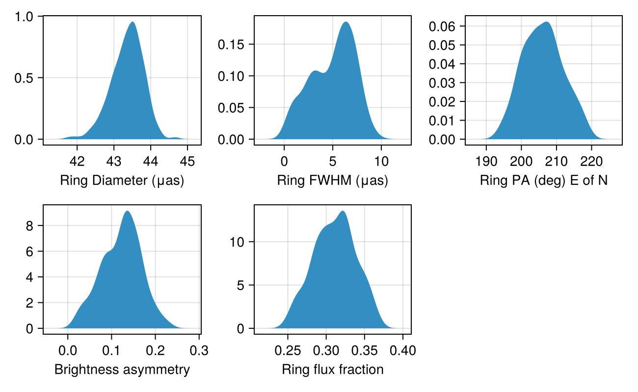 p3 = density(figd[1, 3], -rad2deg.(chain.sky.mp.:1) .+ 360.0, axis = (xlabel = "Ring PA (deg) E of N",))