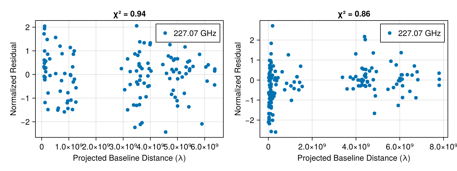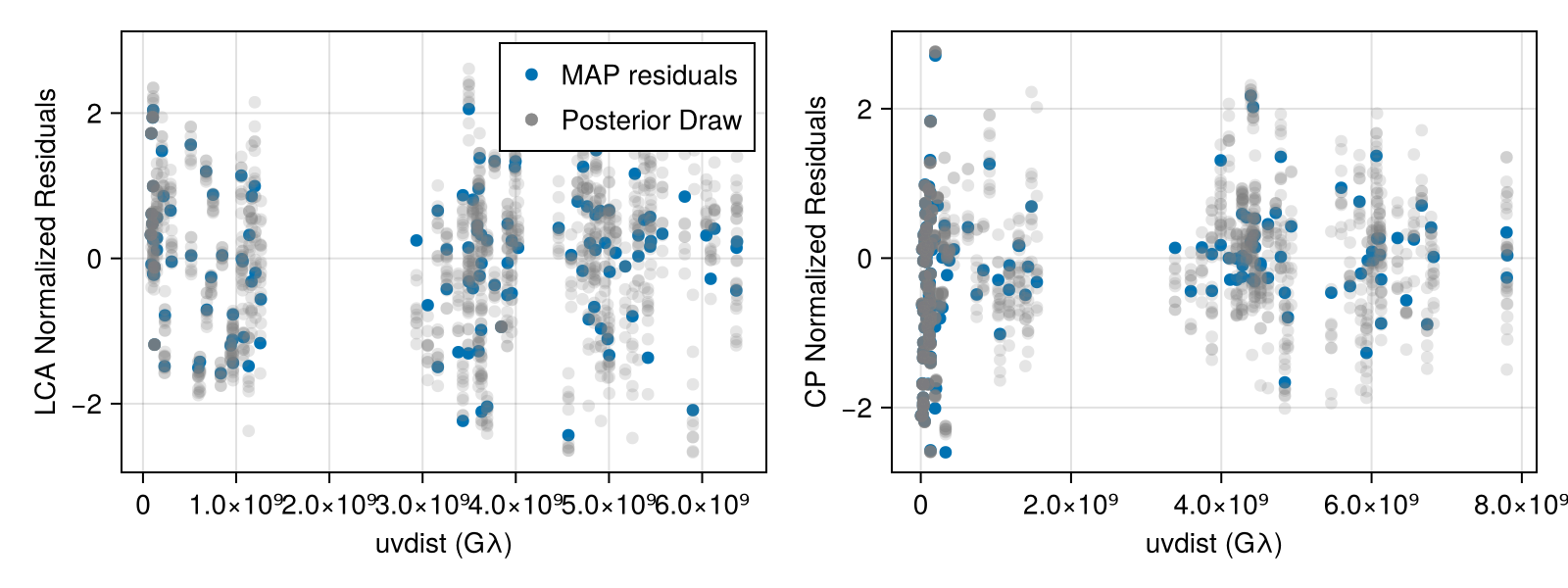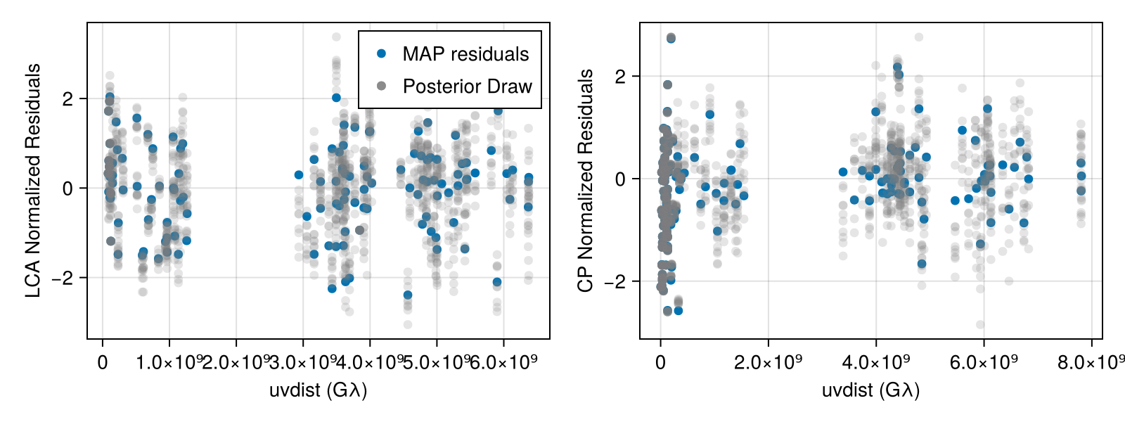 ax2, = baselineplot(fig[1, 2], res[2], :uvdist, :res, label = "MAP residuals", axis = (ylabel = "CP Normalized Residuals", xlabel = "uvdist (Gλ)"))
