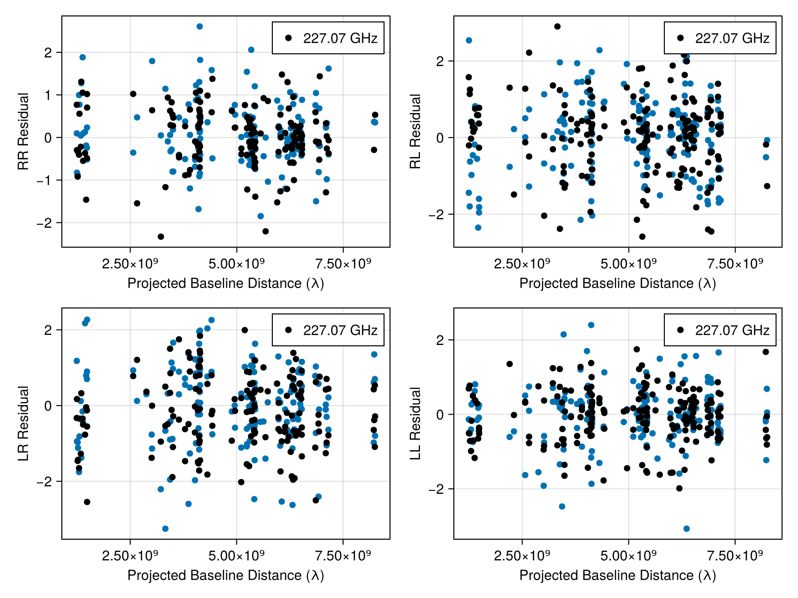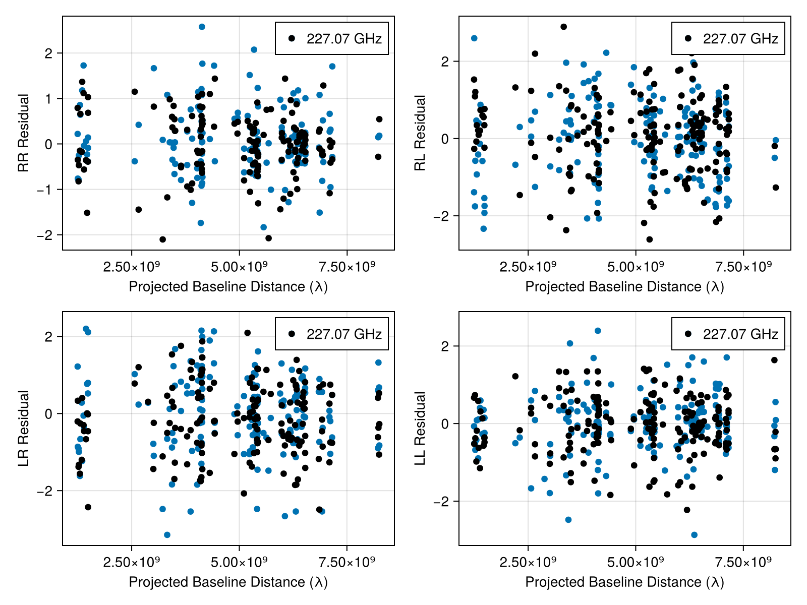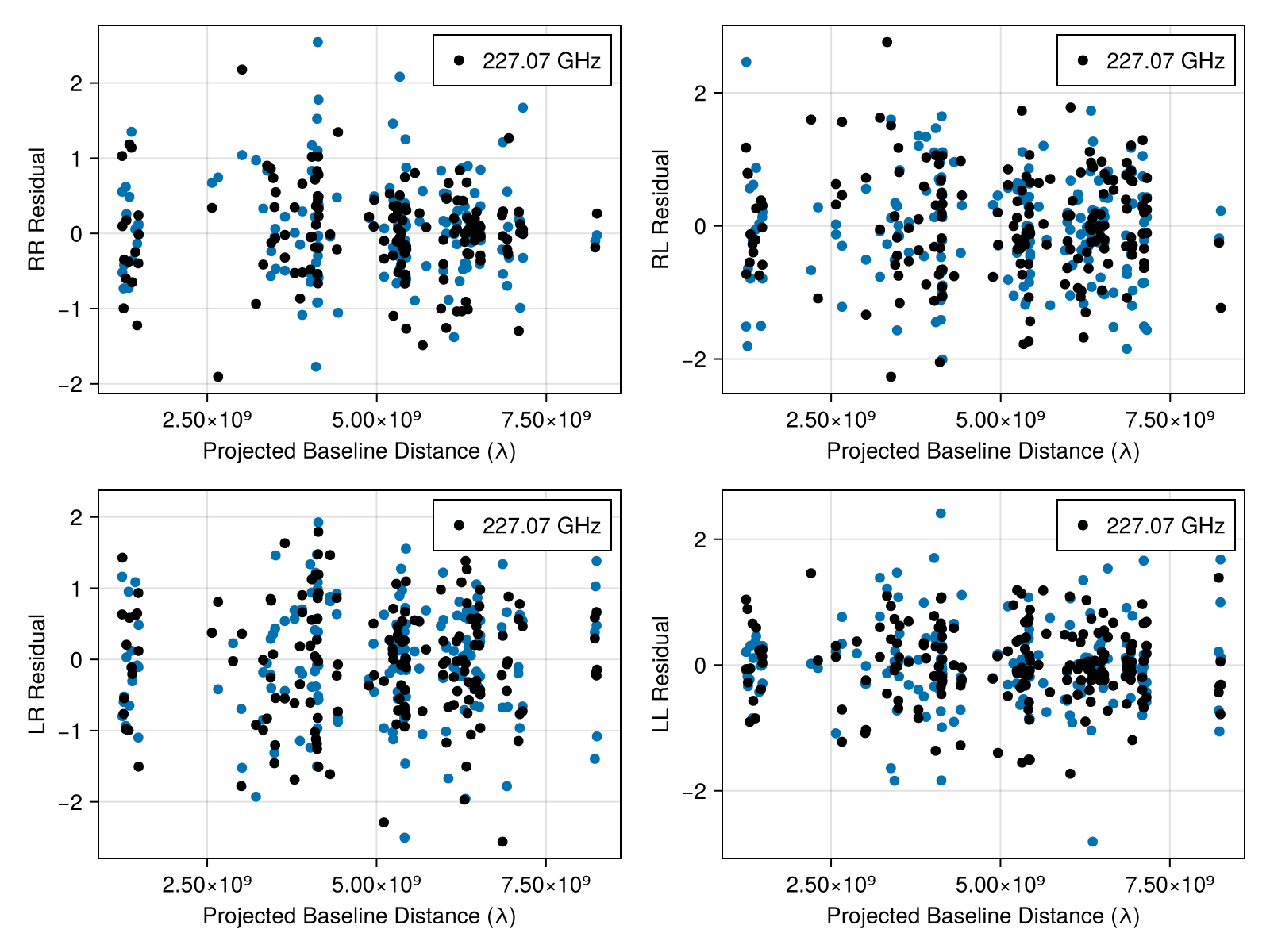 plotfields!(fig[2, 1], res[1], uvdist, x -> Comrade.measurement(x)[2, 1] / noise(x)[2, 1], axis_kwargs = (; ylabel = "LR Residual"))