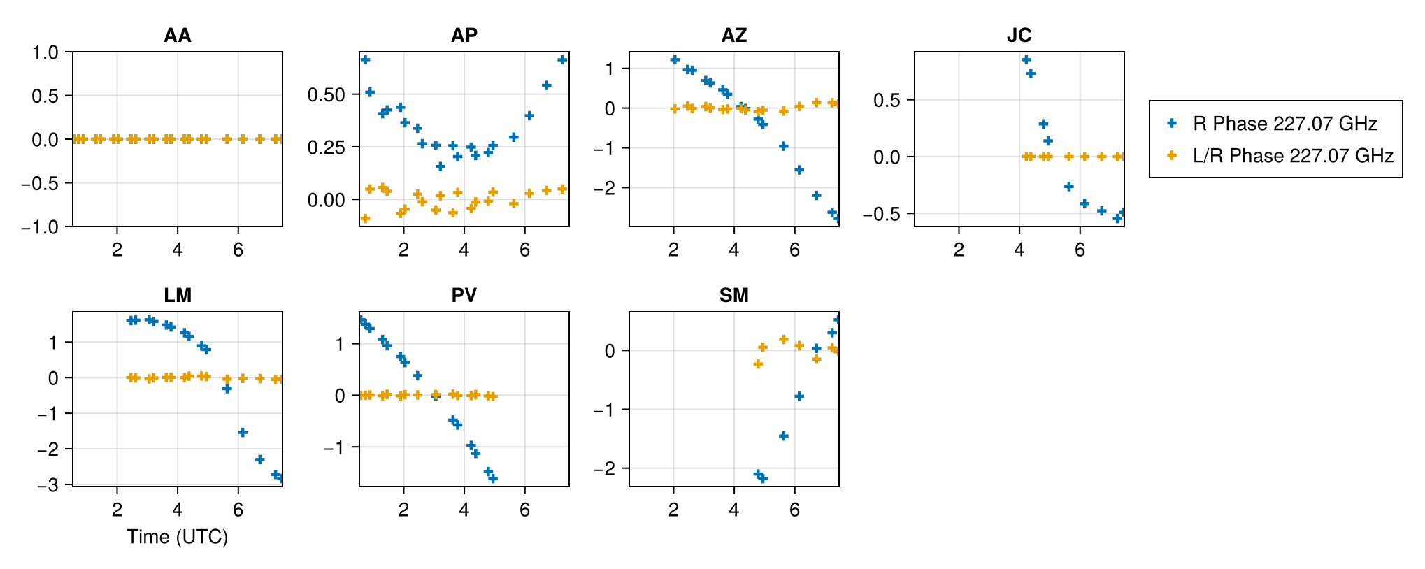 Plotting the phases first, we see large trends in the righ circular polarization phase. This is expected due to a lack of image centroid and the absense of absolute phase information in VLBI. However, the gain phase difference between the left and right circular polarization is stable and close to zero. This is expected since gain ratios are typically stable over the course of an observation and the constant offset was removed in the EHT calibration process.