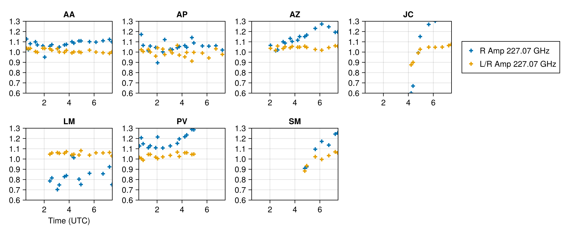fig = plotcaltable(gampr, gamp_ratio, labels = ["R Amp", "L/R Amp"], axis_kwargs = (; limits = (nothing, (0.6, 1.3))));