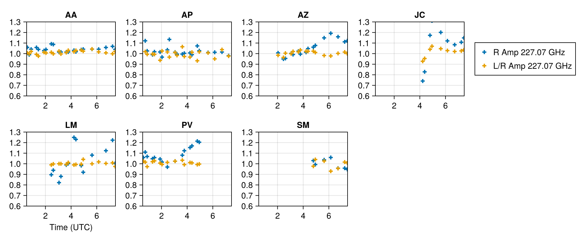 Moving to the amplitudes we see largely stable gain amplitudes on the right circular polarization except for LMT which is known and due to pointing issues during the 2017 observation. Again the gain ratios are stable and close to unity. Typically we expect that apriori calibration should make the gain ratios close to unity.