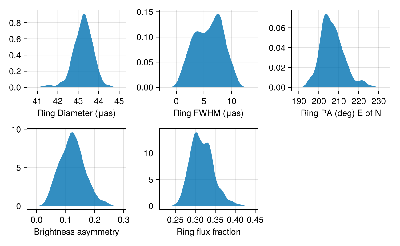 p3 = density(figd[1,3], -rad2deg.(chain.sky.mp.:1) .+ 360.0, axis=(xlabel = "Ring PA (deg) E of N",))