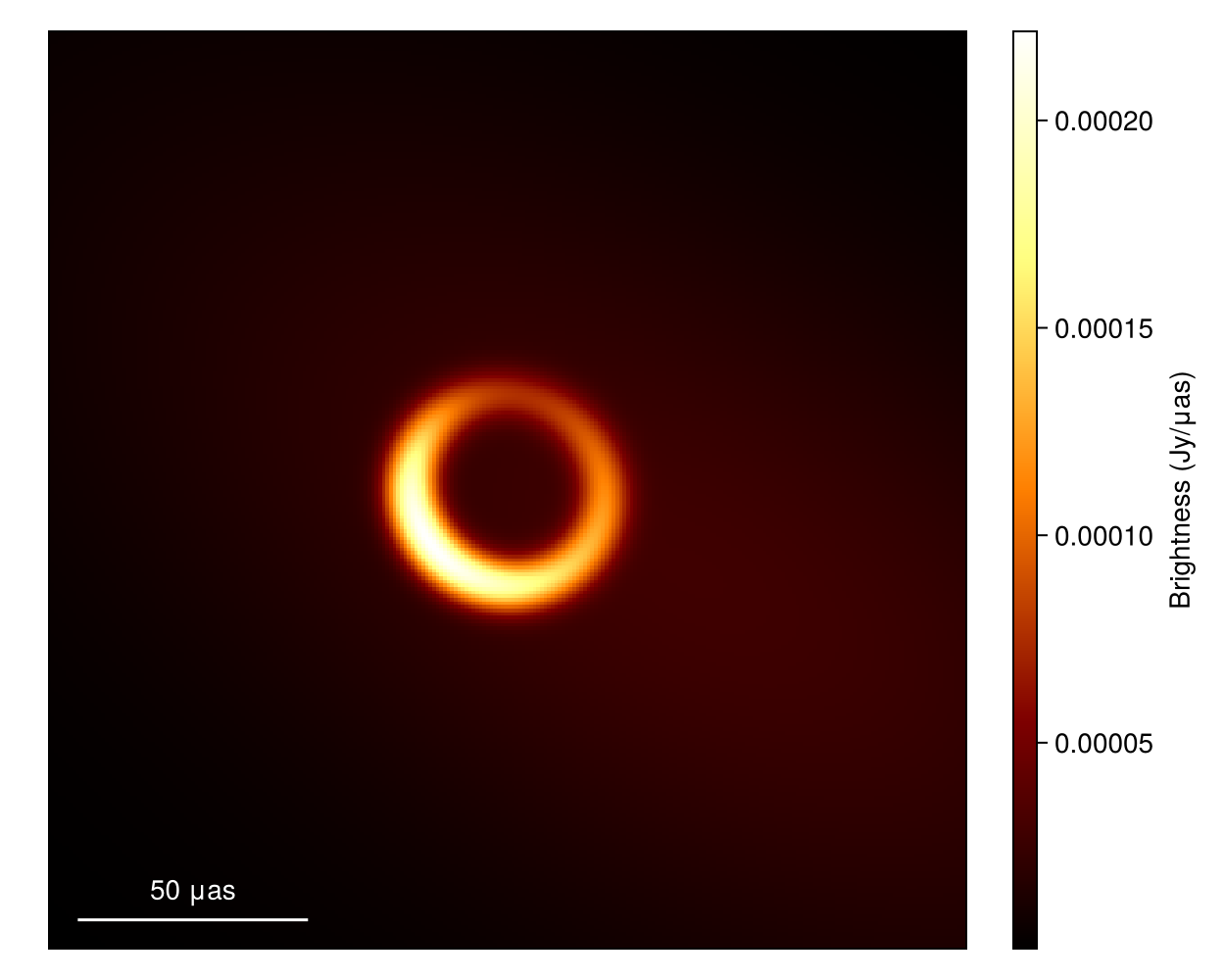 xopt, sol = comrade_opt(post, BBO_adaptive_de_rand_1_bin_radiuslimited(); maxiters=50_000);Given this we can now plot the optimal image or the maximum a posteriori (MAP) image.