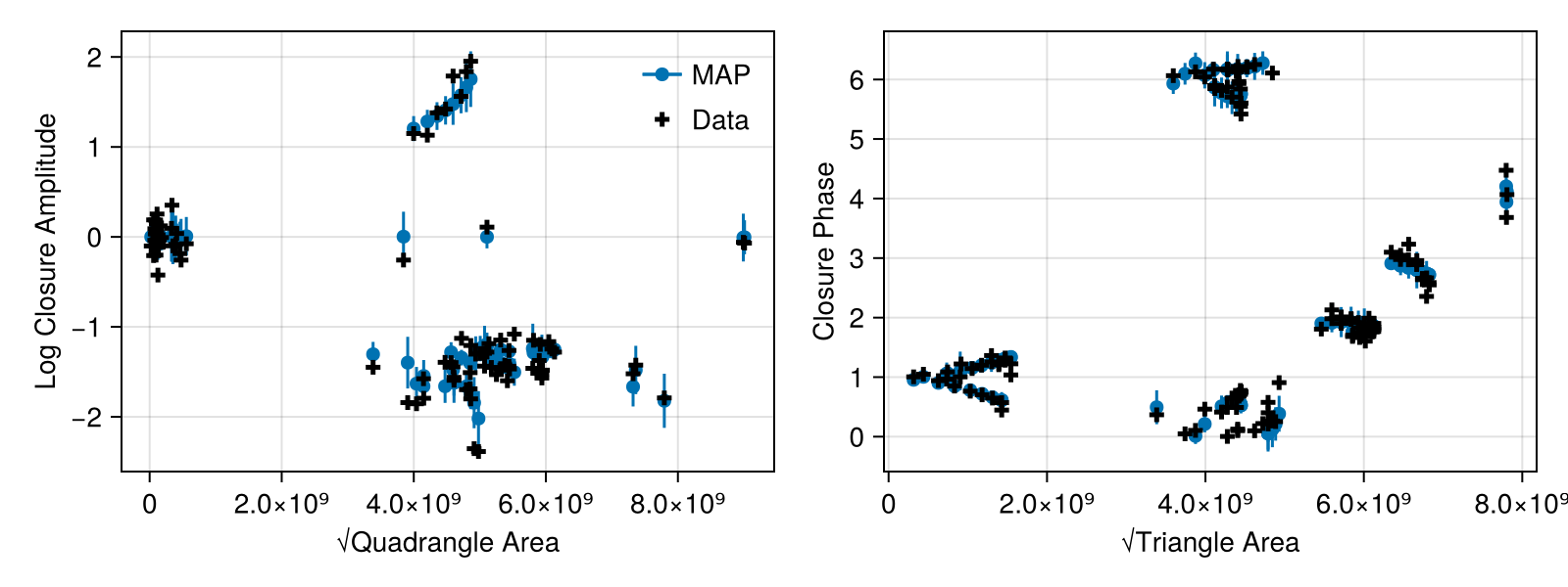 That looks similar to the EHTC VI, and it took us no time at all!. To see how well the model is fitting the data we can plot the model and data products. As of Comrade 0.11.7 Makie is the preferred plotting tool. For plotting data there are two classes of functions