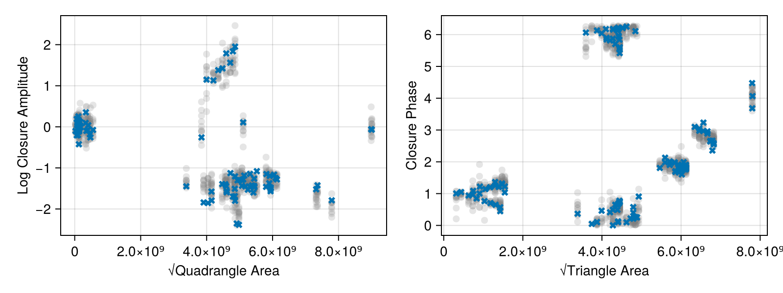 on grid: VLBISkyModels.FourierDualDomainIdealInstrumentModelData Products: Comrade.EHTLogClosureAmplitudeDatumComrade.EHTClosurePhaseDatumNote
