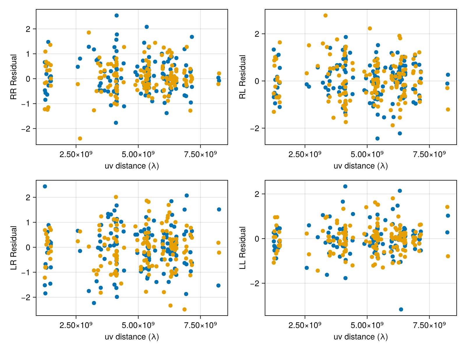 baselineplot(fig[2,2], res[1], :uvdist, x->Comrade.measurement(x)[2,2]/noise(x)[1,1], axis=(ylabel="LL Residual", xlabel="uv distance (λ)"))