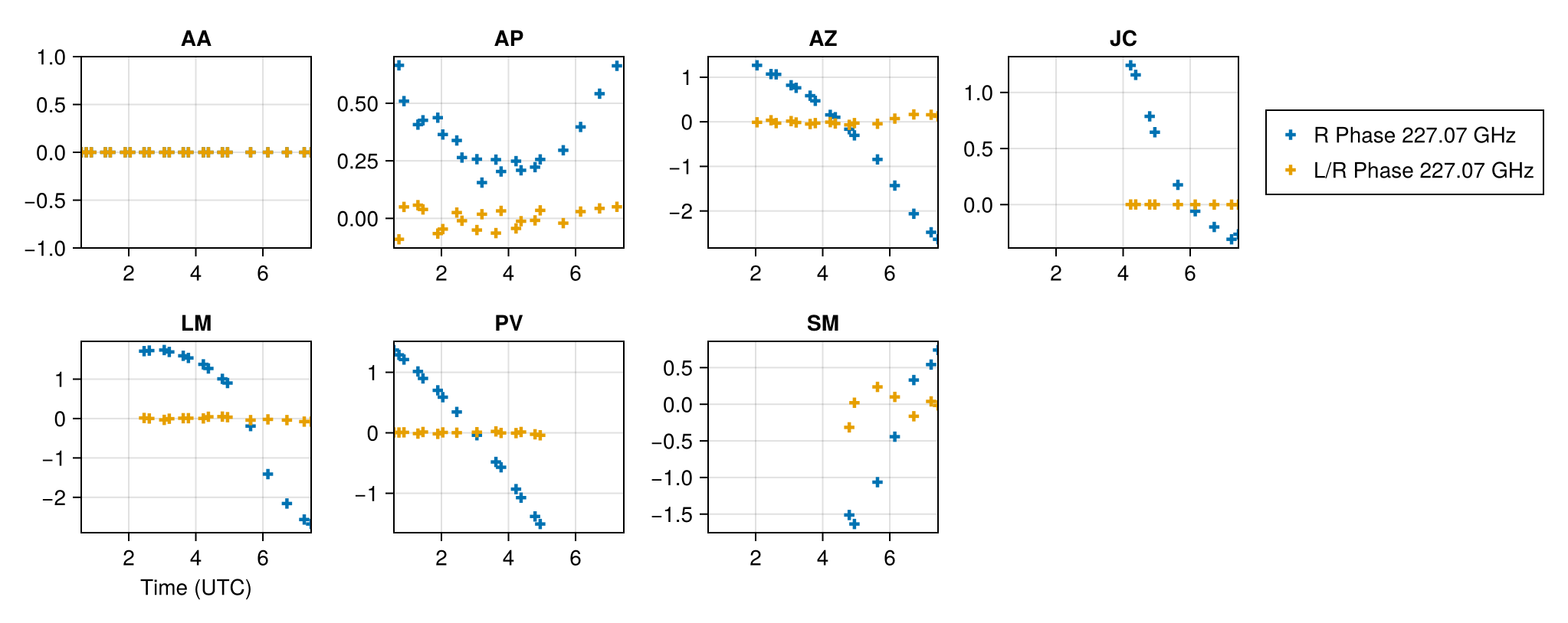 ─────────┴───────────────────┴─────────────────────────────────────────────────────────────Plotting the phases first, we see large trends in the righ circular polarization phase. This is expected due to a lack of image centroid and the absense of absolute phase information in VLBI. However, the gain phase difference between the left and right circular polarization is stable and close to zero. This is expected since gain ratios are typically stable over the course of an observation and the constant offset was removed in the EHT calibration process.