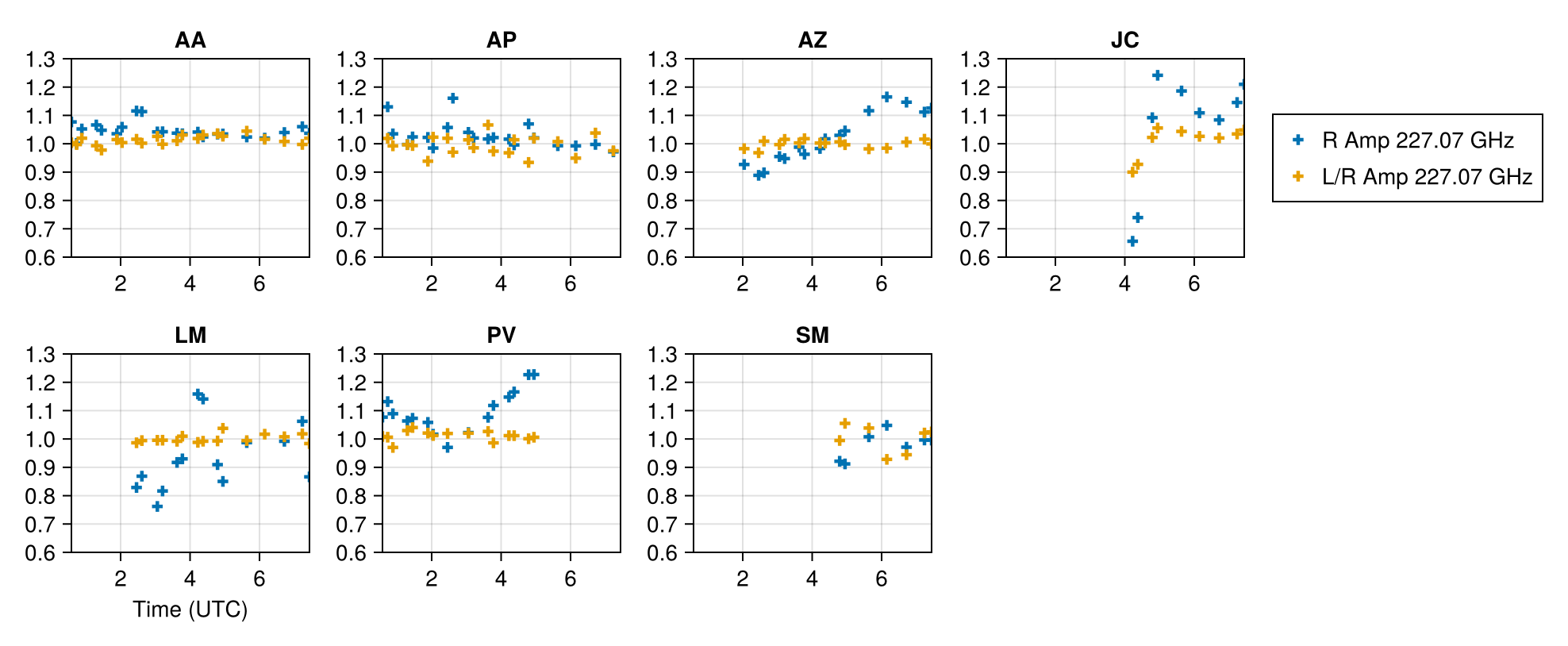 Moving to the amplitudes we see largely stable gain amplitudes on the right circular polarization except for LMT which is known and due to pointing issues during the 2017 observation. Again the gain ratios are stable and close to unity. Typically we expect that apriori calibration should make the gain ratios close to unity.